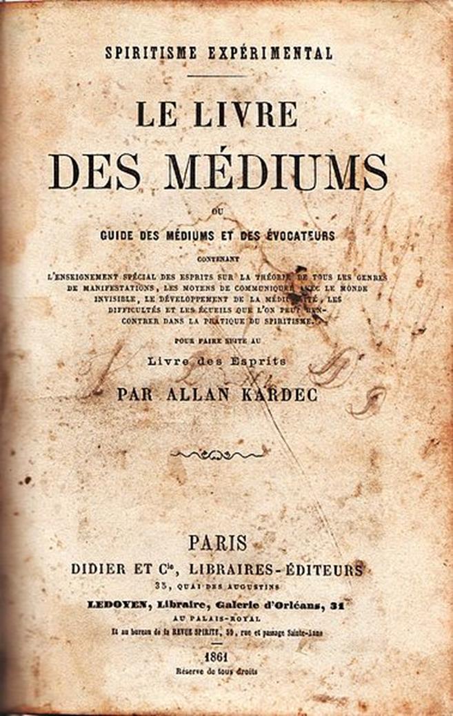 O Livro dos Médiuns. Lançado por Allan Kardec em janeiro de 1861. Fonte: https://commons.wikimedia.org/wiki/File:Le_Livre_des_M%C3%A9diums.jpg |