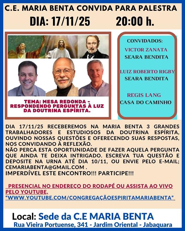 - Sábado, 29 de novembro de 2025: Apresentação gratuita intitulada "Comemorações do Dia de Todos os Santos: Uma Perspectiva Espírita sobre as Homenagens que Prestamos aos Nossos Falecidos".