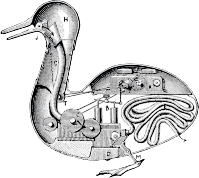 Jacques de Vaucanson (Grenoble, 24 de fevereiro de 1709 — 21 de novembro de 1782) foi um inventor e artista francês que criou vários autômatos inovativos. Sua obra mais conhecida foi um pato mecânico que parecia comer grãos, digeri-los e defeca-los.[1] https://pt.wikipedia.org/wiki/Jacques_de_Vaucanson