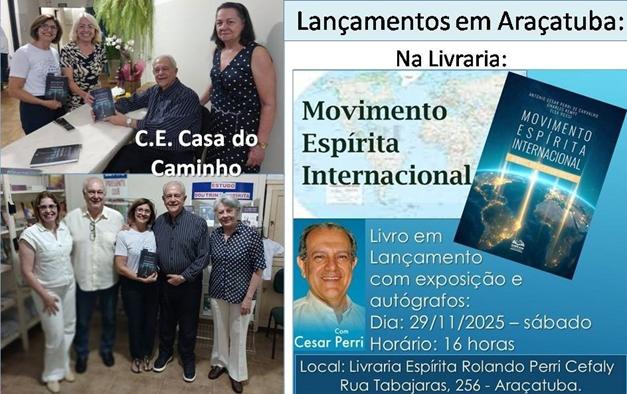 Na noite do dia 26 de novembro Cesar Perri (São Paulo) proferiu palestra na reunião pública do Centro Espírita Casa do Caminho, em Araçatuba (SP), sua terra natal. Desenvolveu tema com relatos de casos registrados no livro “Movimento Espírita Internacional. Origens, ideais e experiências” há pouco editado pelo CCDPE-SP. Em seguida, autografou o novo livro. Estava acompanhado pelo seu irmão Paulo Sérgio, dirigente da Instituição Nosso Lar, e a reunião foi coordenada por dirigentes do C.E. Casa do Caminho. No sábado, dia 29, às 16 horas, o autor lançará esse livro na Livraria Espírita Rolando Perri Cefaly, localizada à rua Tabajaras, 256, em Araçatuba. Informações sobre o livro: https://ccdpe.org.br/produto/movimento-espirita-internacional-origens-ideais-e-experiencias/
