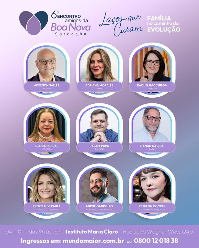 Vem aí o 6º Encontro Amigos da Boa Nova em Sorocaba! Um dia de acolhimento, reflexões e inspiração sobre um dos temas mais importantes da vida: a família. 4 de outubro | Das 9h às 16h Instituto Maria Claro – Sorocaba/SP - Rua João Wagner Wey, 1240 Com o tema “Laços que curam – Família no caminho da evolução”, o evento traz palestras e vivências sobre saúde mental, perdão, reconciliação, missão dos pais, adoção e muito mais! Presenças confirmadas: Adeilson Salles, Adriana Morales, Raquel Bacchiega, Celina Sobral, Rafael Papa, Nando Garcia, Priscila de Paula, palestra musicada de André Gandolfo e apresentação musical de Kethelin Cocchi. Garanta já o seu ingresso em: mundomaior.com.br Vamos juntos fortalecer os laços que curam?