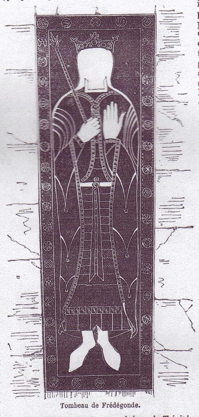 Gravura do túmulo de Fredégonde na história popular contemporânea da França , volume 1 de Charles Lahure. https://fr.wikipedia.org/wiki/Fr%C3%A9d%C3%A9gonde#/media/Fichier:Tombeaudefredegonde.jpg