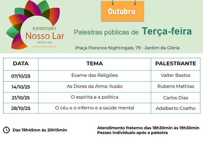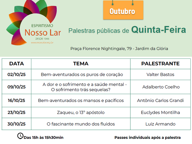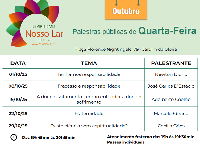 Palestras outubro 2025 IB Nosso lar São Paulo, capital |