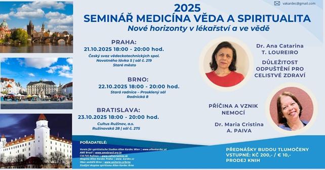 Estamos felizes por termos conseguido recrutar novamente médicos brasileiros da associação médico-espiritual AME Brasil para nossos seminários Medicina, Ciência e Espiritualidade - Novos Horizontes em Medicina e Ciência, e por nossa visita à República Tcheca e à Eslováquia novamente. Os temas sobre o que são as doenças, por que elas nos afligem e como surgem? Qual o papel de nossas emoções e relacionamentos interpessoais nisso são, sem dúvida, relevantes para cada um de nós. Essas e muitas outras causas de doenças serão explicadas por nossos convidados e palestrantes do Brasil. A pneumologista Dra. Maria Cristina Alochio Paiva e a nefrologista Dra. Ana Catarina Loureiro, em suas explicações sobre a causa e a origem das doenças e a importância do perdão para alcançar a saúde integral. Ambos os médicos são membros da Associação Médico-Espírita Brasileira AME Brasil. Os membros da AME são pesquisadores, cientistas e médicos reconhecidos internacionalmente, cujo objetivo é construir uma conexão entre ciência, filosofia e a essência imortal do ser humano; Em seus esforços, eles são guiados pelo ideal cristão universal, ético e moral, no qual o amor, o respeito mútuo e a tolerância são a base. PRAGA: 21/10/2025 18:00 - 20:00 h. União Tcheca de Sociedades Científicas e Técnicas. Novotného lávka 5 | Pavilhão nº 219, Cidade Velha