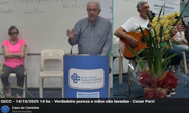 Na reunião pública da tarde do dia 14 de outubro, Cesar Perri abordou o tema “verdadeira pureza e mãos não lavadas” (Cap. VIII de “O evangelho segundo o espiritismo”, itens 8-10). A reunião foi dirigida por Inês Bareia e contou com apresentação de violão e canto com Helson Lever Camilli. Acesse pelo link: https://www.youtube.com/watch?v=cVEZeo98S9U