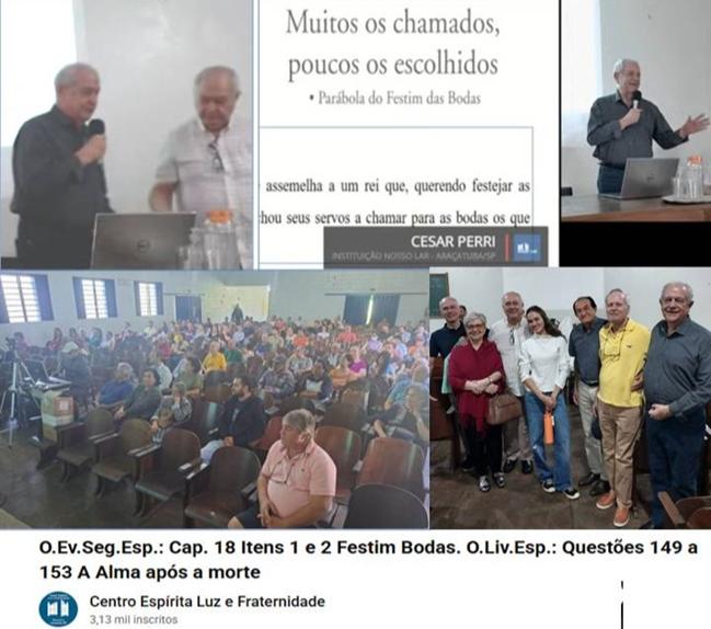 Na reunião pública do dia 19/10/2025, na Instituição Nosso Lar, Araçatuba (SP), o tema “parábola do festim de bodas” de “O Evangelho Segundo o Espiritismo” (Capítulo 18) foi desenvolvido por Cesar Perri, de São Paulo em visita à Instituição, e o tema “a alma após a morte” (“O Livro dos Espíritos”, q. 149-153) foi abordado por Paulo Cacciatori. A reunião foi dirigida por Paulo Sérgio Perri de Carvalho. Presentes Célia Carvalho, Ismael Gobbo e esposa, e colaboradores da Estação Dama da Caridade. A reunião pública é transmitida pela Instituição e pela Estação Dama da Caridade Benedita Fernandes. Acesse pelo link: https://www.youtube.com/watch?v=5kFXr6d4CU4&t=2100s