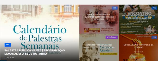 Acompanhe a programação semanal de palestrasAs reuniões públicas da FEB são um convite a todos para momentos de reflexão a partir da leitura do Evangelho do Cristo e de obras organizadas por Allan Kardec. As exposições semanais da sede histórica no Rio de Janeiro são realizadas às terças, das 13h30 às 14h30; sextas, das 13h às 14h; e aos sábados, das 10h às 11h, no salão térreo, localizado na Av. Passos nº 28/30, Centro. Em Brasília, o Auditório principal do prédio Ismael, localizado na sede administrativa da FEB na Asa Norte (SGAN 603, conj. F), é o espaço para as palestras às terças e sextas, às 19h30, e aos domingos, às 17h. Após a palestra, o passe é realizado no local aos interessados. O formato híbrido permanece na grade de programação das palestras aos domingos, às 17h, com transmissão ao vivo direto do Auditório, em Brasília, nos canais oficiais da FEB nas redes sociais: facebook.com/FEBoficial, facebook.com/febtvBrasil e também na FEBlives.com Confira a programação desta semanaSede histórica no Rio de Janeiro21/10, às