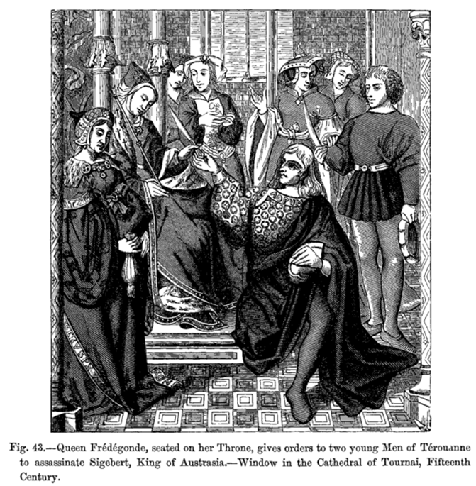 A Rainha Fredegunda, sentada em seu trono, ordena a dois jovens de Terouanne que matem Sigebert, Rei da Áustrásia. Janela na Catedral de Tournai, séc., XV. Fonte: https://en.wikipedia.org/wiki/Fredegund