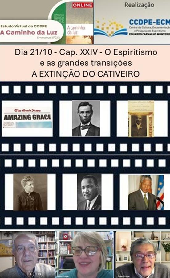 O tema “a extinção do cativeiro”, um item do Cap. XXIV - O Espiritismo e as grandes transições, do livro “A Caminho da Luz”, foi desenvolvido por Cesar Perri no estudo virtual desta obra, na noite do dia 21 de outubro. A partir de citações do autor espiritual, o expositor focalizou ações de vários vultos vinculados aos movimentos de emancipação dos escravos negros. A reunião foi coordenada por Pedro Nakano com apoio técnico de Kátia Golinelli. Trata-se de programa do Centro de Cultura, Documentação e Pesquisa do Espiritismo-CCDPE (São Paulo), com base no livro de autoria do espírito Emmanuel, psicografia de Chico Xavier. Esse estudo anual é coordenado por Perri, como reuniões virtuais desenvolvidas às 3as feiras, 20 horas.