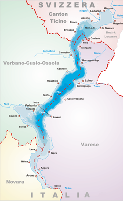 Lago Maior entre Itália e Suíça. Imagem/fonte: https://en.wikipedia.org/wiki/Lake_Maggiore#/media/File:Lago_Maggiore-Mappa.png |
