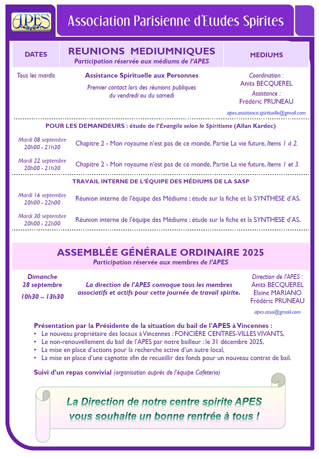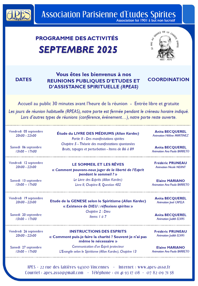APES: programa de atividades espiritualistas SETEMBRO 2025 Paris, França |