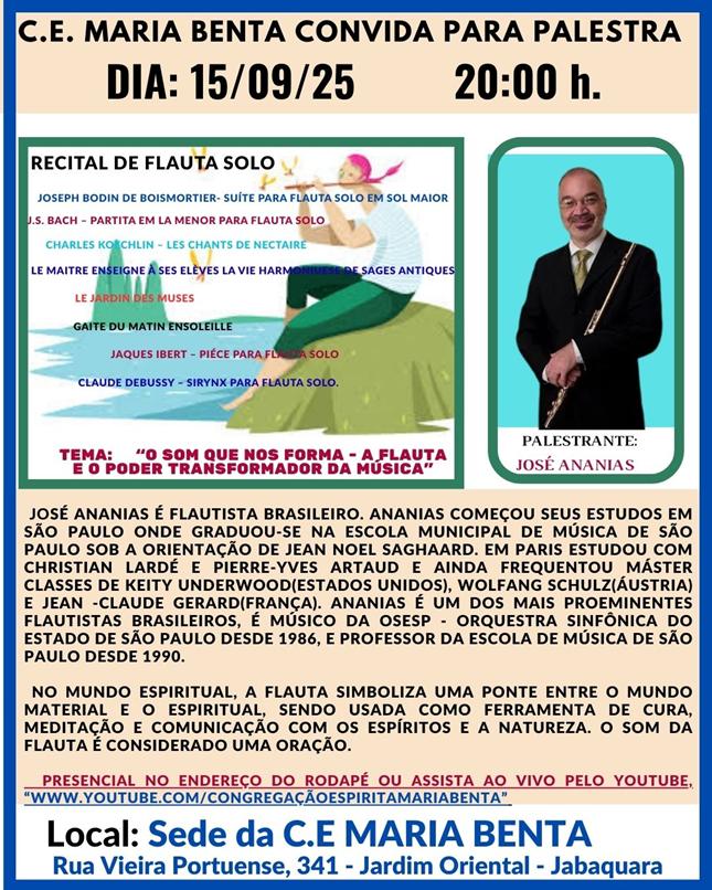 - Sexta-feira, 19 de setembro e sábado, 6 de setembro de 2025: Estudo do livro A GÊNESIS Segundo o Espiritismo (Allan Kardec), Capítulo 2: Deus, "Existência de Deus: Reflexões Espíritas".