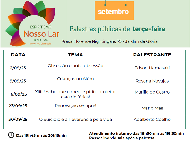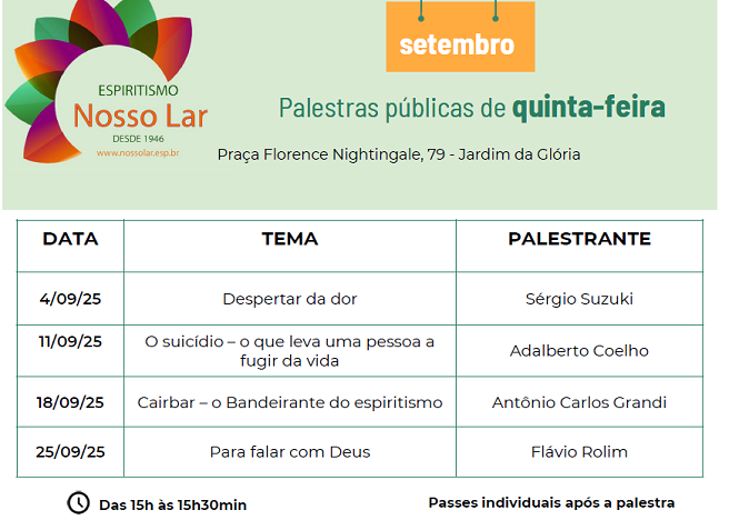 Temas espíritas que nos desafiam sobre nossa existência como Espíritos em evolução: entrada franca. - Sexta-feira, 12 de setembro e sábado, 13 de setembro de 2025: O Livro dos Espíritos (Allan Kardec), Livro 2, Capítulo 8: Sono e Sonhos: "Como podemos julgar a liberdade do Espírito durante o sono?" - Sexta-feira, 26 de setembro e sábado, 27 de setembro de 2025: O Evangelho Segundo o Espiritismo (Allan Kardec), Capítulo 13: Instruções dos Espíritos: "Como posso fazer caridade? Muitas vezes, nem tenho o que preciso." Comunicação de um espírito protetor.