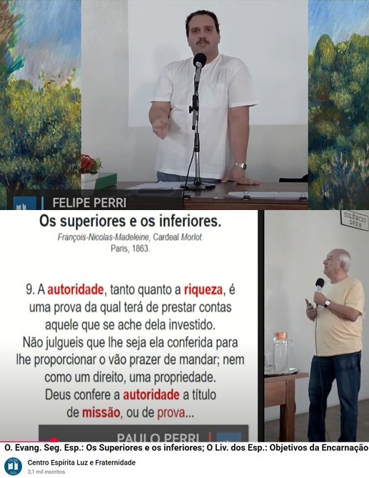 Na reunião pública do dia 21/09/2025, na Instituição Nosso Lar, Araçatuba (SP), o tema “os superiores e os inferiores” de “O Evangelho Segundo o Espiritismo” (Capítulo 17, item 9) foi desenvolvido por Paulo Sérgio Perri de Carvalho e o tema “objetivos da encarnação” (“O Livro dos Espíritos”, q. 132-133) foi abordado por Felipe Perri. A reunião pública é transmitida pela Instituição e pela Estação Dama da Caridade Benedita Fernandes, Acesse pelo link: https://www.youtube.com/watch?v=_QodI9gYqok