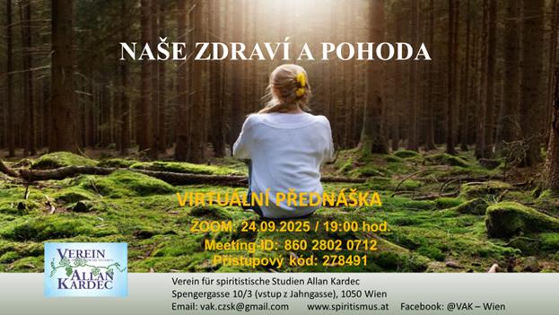 zasíláme pozvánku na naši virtuální přednášku, která se uskuteční dne 24.09.2025 v 19:00 hodin na téma Naše zdraví a pohoda z mediumicky psané knihy brazilským médiem Divaldem Francem „Chvíle zdraví a vědomí“ a přikládáme link pro vstup do sálu Zoom: Zoom Meeting: V případě dotazu nám pište na: [email protected]