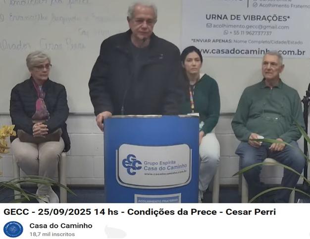 Na reunião pública vespertina do dia 25 de setembro, Cesar Perri comentou os itens sobre “condições da prece” do Cap. 27 de “O Evangelho segundo o Espiritismo”, no Grupo Espírita Casa do Caminho, em São Paulo. A reunião contou com a participação de Célia Maria Rey de Carvalho, Marcelly Casagrande e do presidente Régis Lang. Esse Centro localizado na Vila Mariana, na capital paulista, mantém reuniões públicas e transmitidas pela internet, de 2ª a 6ª feira, às 14 e às 19 horas; aos sábados e domingos pela manhã. Acesse pelo link: https://www.youtube.com/watch?v=yQUcOx25EPk&t=385s