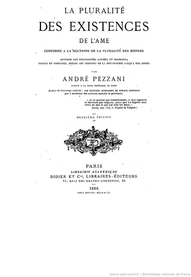 Livro de André Pezzani: A pluralidade das existências da alma: de acordo com a doutrina da pluralidade dos mundos. Acesse a edição em francês aqui: |