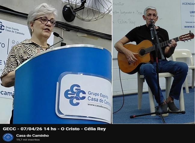Na reunião vespertina do dia 07 de abril no Grupo Espírita Casa do Caminho, em São Paulo, Célia Maria Rey de Carvalho proferiu palestra sobre o tema “O Cristo”, com base em “O Evangelho segundo o Espiritismo” (Cap. I). A reunião foi dirigida por Inês Bareia. Preliminarmente houve apresentação de violão e canto com Helson Lever Camilli. Acesse pelo link: https://www.youtube.com/watch?v=_4KR0aWLFVc