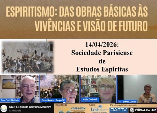 O primeiro Centro Espírita do mundo, a Sociedade Parisiense de Estudos Espíritas, fundada por Allan Kardec foi o tema desenvolvido no dia 14 de abril, por Cesar Perri (São Paulo), no estudo virtual por ele coordenado - “Espiritismo: das Obras Básicas, às vivências e visão de futuro” -, promovido pelo Centro de Cultura, Documentação e Pesquisa do Espiritismo Eduardo Carvalho Monteiro, de São Paulo. O expositor apresentou dados sobre a fundação, objetivos e atividades da pioneira Sociedade, com projeção de power point. A reunião foi coordenada por Pedro Nakano, com apoio técnico de Kátia Golinelli, e de Sidnei Zaluchi (da USE-SP), As transmissões ocorrem às 20 horas das 3as feiras, pelo canal do You Tube do CCDPE, e conta com parcerias da Estação Dama da Caridade Benedita Fernandes/RAETV e da WebRadio Portal da Luz. Acesse pelo link: https://www.youtube.com/watch?v=-CEJjW5f1A8