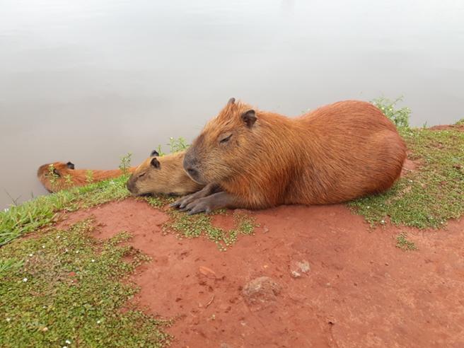 Capivaras. Lagoa Maior. Três Lagoas, MS. Foto Ismael Gobbo A capivara (nome científico: Hydrochoerus hydrochaeris) é uma espécie de mamífero roedor da família Caviidae e subfamília Hydrochoerinae. Alguns autores consideram que deva ser classificada em uma família própria. Está incluída no mesmo grupo de roedores ao qual se classificam as pacas, cutias, os preás e o porquinho-da-índia. Ocorre por toda a América do Sul ao leste dos Andes em habitats associados a rios, lagos e pântanos, do nível do mar até 1 300 m de altitude. Extremamente adaptável, pode ocorrer em ambientes altamente alterados pelo ser humano. É o maior roedor do mundo, pesando até 91 kg e medindo até 1,2 m de comprimento e 60 cm de altura. A pelagem é densa, de cor avermelhada a marrom escuro. É possível distinguir os machos por conta da presença de uma glândula proeminente no focinho apesar do dimorfismo sexual não ser aparente. Existe uma série de adaptações no sistema digestório à herbivoria, principalmente no ceco. Alcança a maturidade sexual com cerca de 1,5 ano de idade, e as fêmeas dão à luz geralmente a quatro filhotes por vez, pesando até 1,5 kg e já nascem com pelos e dentição permanente. Em cativeiro, pode viver até 12 anos de idade. Leia mais: https://pt.wikipedia.org/wiki/Capivara