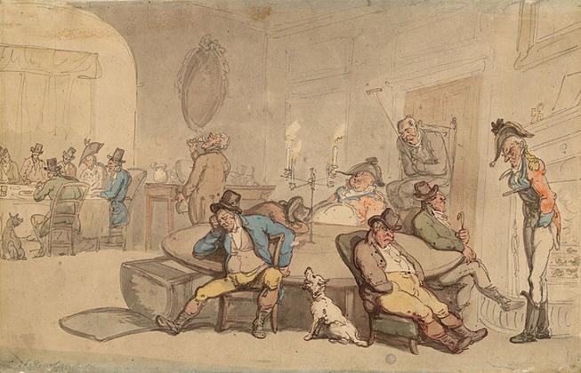 Caricatura original em aquarela assinada por Rowlandson; cena no club lounge, mostrando membros e atendentes sentados, cochilando, comendo etc., incluindo 2 oficiais do exército e cachorro. Fonte: Brown University. Autor: Thomas Rowlandson. Copiado de: https://commons.wikimedia.org/wiki/File:British_club_scene.jpg |