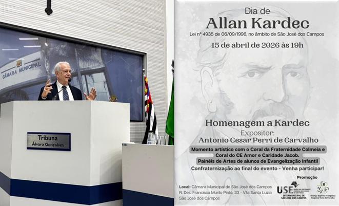 Na noite do dia 15 de abril, o auditório da Câmara de Vereadores de São José dos Campos esteve lotado em evento oficial em homenagem a Allan Kardec. Na palestra alusiva ao vulto, Cesar Perri (de São Paulo) focalizou as ações educacionais, humanísticas e espíritas do "bom senso encarnado" na definição de Flammarion. Compuseram a mesa e usaram da palavra: vereadores Fernando Petit e Carlos Abranches; o presidente da USE Intermunicipal, Rodolfo Collevatti, e o representante da Aliança Espírita Evangélica, Carlos Daniel, estas duas instituições promotoras do evento; sendo mestre de cerimônia Apparecido José Orlando (ex-presidente da USE-SP). Estavam presentes representantes de dezenas de instituições espiritas. Houve apresentações dos corais Fraternidade Colmeia e do C.E. Amor e Caridade Jacob. No hall de entrada foi montada exposição de painéis de arte de participantes da evangelização infantil. Nesse ambiente houve confraternização no final. O "dia de Kardec' foi definido por Lei Municipal 4935 de 1996.