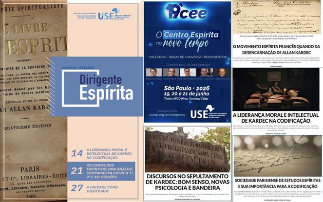 A edição da revista digital Dirigente Espírita, março/abril de 2026, da USE – União das Sociedades Espíritas do Estado de São Paulo, apresenta sob a bandeira da união e da unificação, as ações necessárias para um ano de intensa atividade doutrinária pela que terá seu apogeu em junho com o 19o Congresso Estadual de Espiritismo, sob o tema central O centro espírita no novo tempo. Várias matérias homenageando Kardec e sua obra: - O movimento espírita francês quando da desencarnação de Allan Kardec, por Charles Kempf (da França); - A liderança moral e intelectual de Kardec na Codificação é destacada por Norberto Tomasini Júnior; - Sociedade Parisiense de Estudos Espíritas foi focalizada por Alessandro Viana Vieira de Paula; - Antonio Cesar Perri de Carvalho recupera os discursos proferidos no sepultamento de Kardec, revelando o perfil de “bom senso encarnado” do mestre. - Luís Jorge Lira Neto oferece análise comparativa entre as edições de O livro dos espíritos, demonstrando o labor contínuo de Kardec no aprimoramento da obra. Na Palavra da Presidência, por Julia Nezu, destaca 2026 como um período de grande mobilização dos espíritas paulistas, culminando com o 19o Congresso Estadual de Espiritismo que também contará com o 1o Encontro de Ciência e Pesquisa Espírita. O espírito de coesão é reforçado por João Thiago de Oliveira Garcia na campanha “A USE somos todos nós”, que nos recorda que a força institucional reside no sentimento de pertencimento e na unidade visual de cada centro Na seção Circuito Aberto, Marco Milani nos apresenta reflexões sobre a “ilusão materialista de justiça” e a importância de ver o espiritismo além de repetições devocionais. Em um cenário digital complexo, João Thiago alerta para o uso da inteligência artificial na simulação de comunicações espirituais, exortando-nos à prudência ativa. Homenagens a trabalhadores com atuação no estado de São Paulo que retornaram à pátria espiritual, como Luiz Fernando Penteado, Miguel de Jesus Sardano e a jovem Juliana Faustino Bassetto. Acesse pelo link: https://usesp.org.br/wp-content/uploads/2026/03/rdDE-211.pdf
