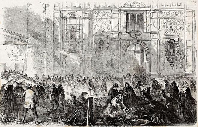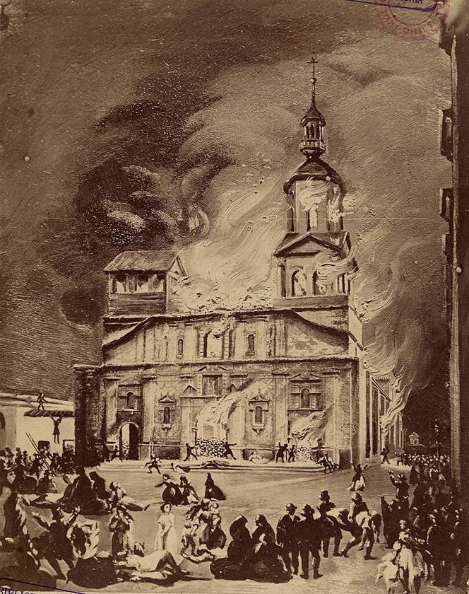 Incêndio da Igreja A Companhia de Jesus, 8 de dezembro de 1863, Santiago. Dedicada à Biblioteca Nacional por Luis Montt Imagem/fonte: https://commons.wikimedia.org/wiki/File:Incendio_de_la_Iglesia_de_la_Compa%C3%B1%C3%ADa_(cropped).jpg |