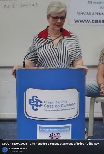 Na reunião matutina do dia 18 de abril no Grupo Espírita Casa do Caminho, em São Paulo, Célia Maria Rey de Carvalho proferiu palestra sobre o tema “justiça e causas atuais das aflições”, com base em O Evangelho segundo o Espiritismo (Cap. V). A reunião foi conduzida por Rogério Ferraro. Acesse pelo link: https://www.youtube.com/watch?v=zAu1e7bLg_4