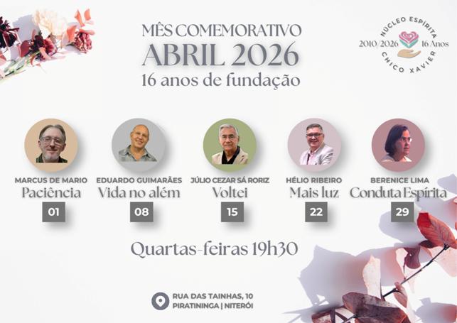 Em abril o Núcleo Espírita Chico Xavier (NECX), fundado em 25 de abril de 2010, completa 16 anos de atividades.