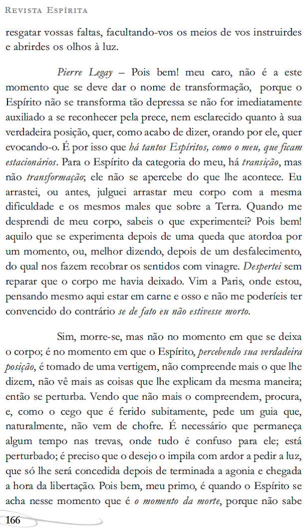 É verdade que esta e outras questões se afastam do ponto de vista moral, que é a meta essencial do Es- Piritismo. Eis por que seria um equívoco fazê-las objeto de preocupações constantes. Sabemos, aliás, no que respeita ao princípio das coisas, que os Espíritos, por não saberem tudo, só dizem o que sabem ou que pensam saber. Mas como há pessoas que poderiam tirar da divergência desses sistemas uma indu- ção contra a unidade do Espiritismo, precisamente porque são formulados pelos Espíritos, é útil poder comparar as razões pró e contra, no interesse da própria doutrina, e apoiar no assentimento da maioria o julgamento que se pode fazer do valor de certas comunicações. (Revista Espírita, 1862, p. 38.)