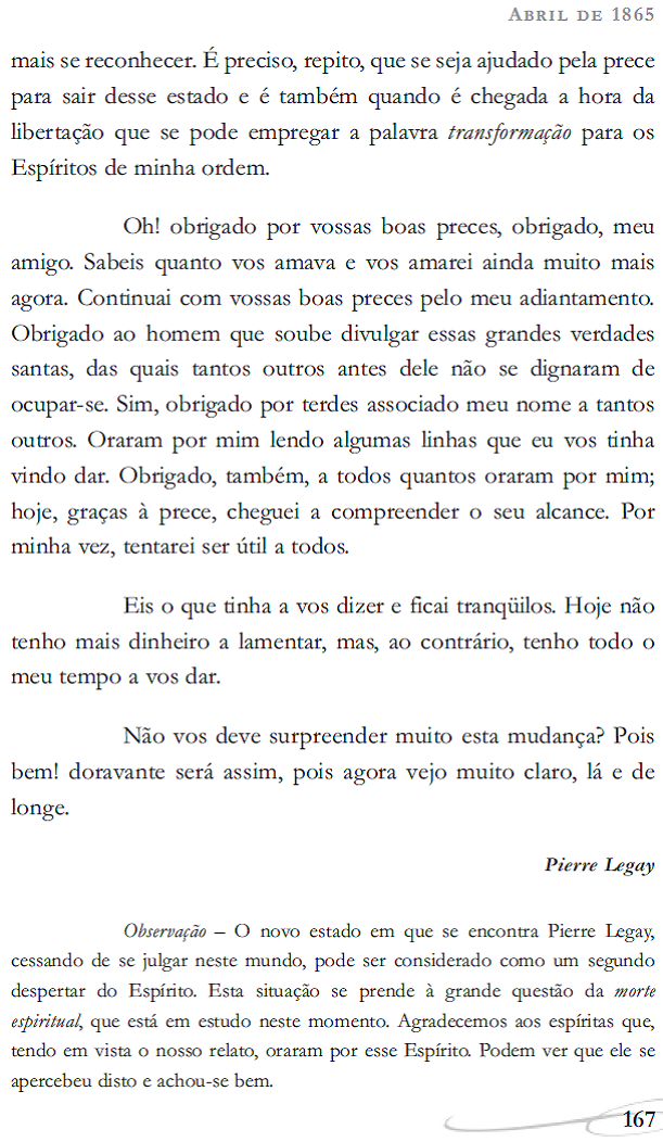 Quando, na Revista Espírita de janeiro de 1862, publicamos um artigo sobre a “Interpretação da doutri- na dos anjos decaídos”, apresentamos essa teoria como simples hipótese, sem outra autoridade afora a de uma opinião pessoal controversível, porque nos faltavam então elementos bastantes para uma afirma- ção peremptória. Expusemo-la a título de ensaio, tendo em vista provocar o exame de questão, decidi- do, porém, a abandoná-la ou modificá-la, se fosse preciso. Presentemente, essa teoria já passou pela prova do controle universal. Não só foi bem aceita pela maioria dos espíritas, como a mais racional e a mais concorde com a soberana Justiça de Deus, mas também foi confirmada pela generalidade das ins- truções que os Espíritos deram sobre o assunto. O mesmo se verificou com a que concerne à origem da raça adâmica. A gênese, cap. XI, item 43, Nota, p. 292.)