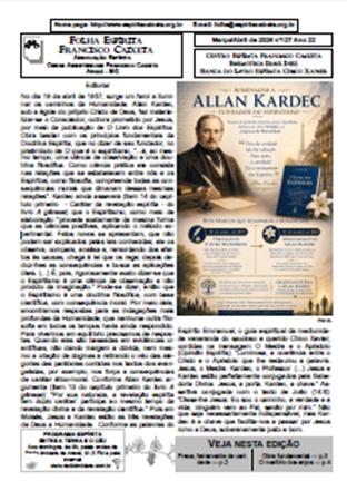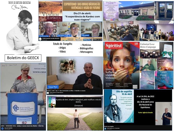 Datas espíritas marcantes do mês de abril; A experiência de Kardec com suas viagens; O dia nacional do espiritismo; Justiça das aflições na compreensão espírita; Suicídio e loucura na visão espírita; Dinâmico Centro dos Estados Unidos inaugura sede; Revista espírita em inglês completa 18 anos; Como testemunhar