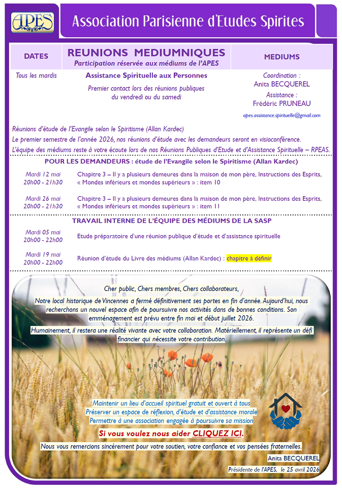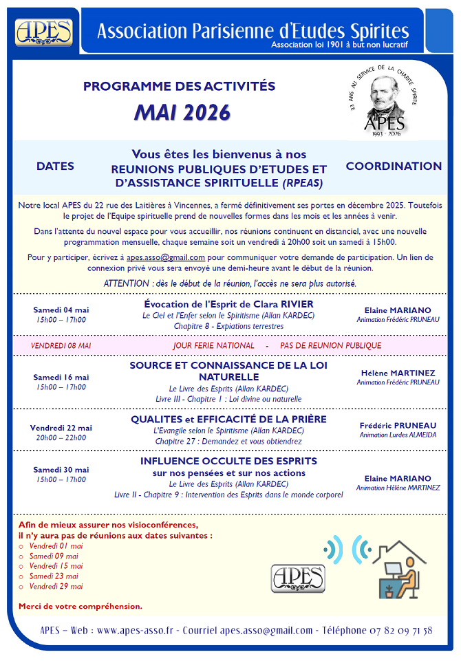 Monsieur, · une semaine le samedi après-midi de 15h à 17h, · la semaine suivante le vendredi soir de 20h à 22h, · ainsi de suite... Veuillez trouver le programme de nos activités spirites de MAI 2026 en pièce jointe et sur http://www.apes-asso.fr