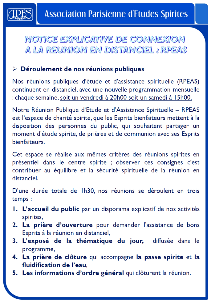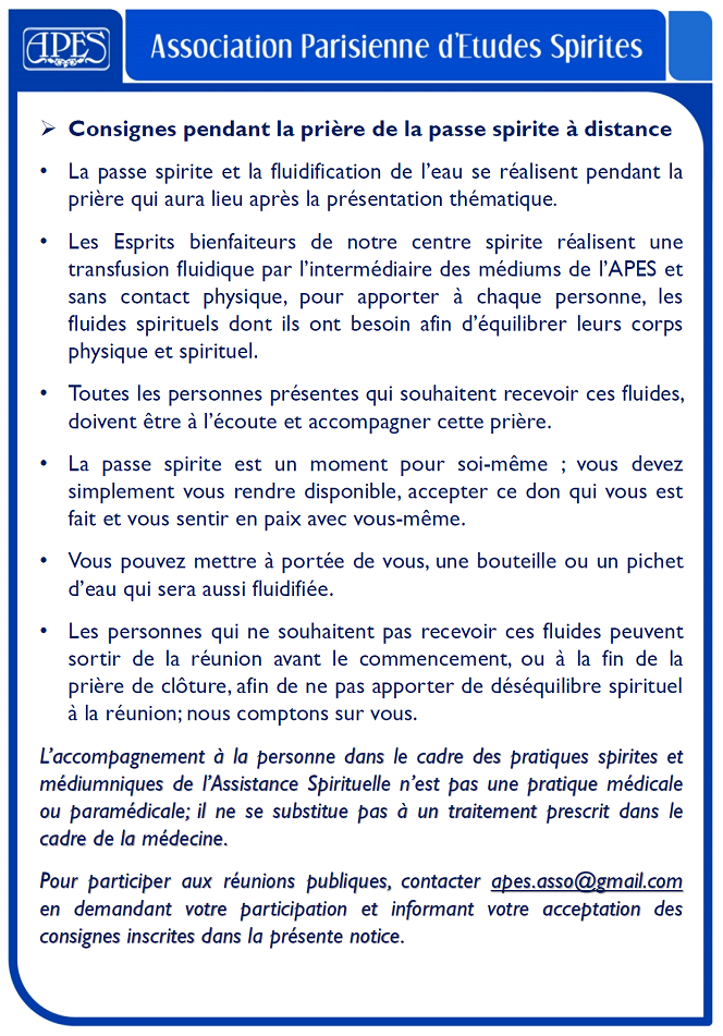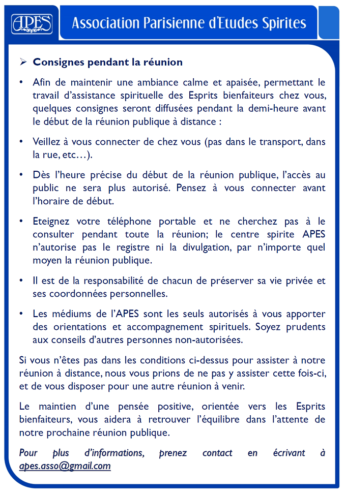 A.P.E.S. - Association Parisienne d'Etudes Spirites - Association loi 1901 Spiritisme : Construire aujourd'hui l'Homme de demain. 22 rue des laitières - 94300 Vincennes Réunions publiques en distanciel (accès libre et gratuit) : un vendredi ou un samedi sur deux, alternativement (sauf jours fériés). Plus d'informations sur notre site internet http://www.apes-asso.fr ou par téléphone 07 82 09 71 58