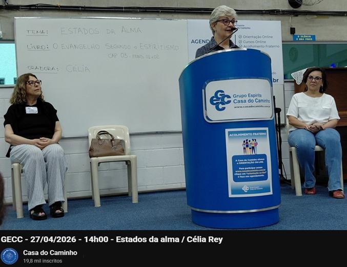 Na reunião vespertina do dia 27 de abril no Grupo Espírita Casa do Caminho, em São Paulo, Célia Maria Rey de Carvalho proferiu palestra sobre o tema “estados de alma”, com base em O Evangelho segundo o Espiritismo (Cap. III). A reunião foi conduzida por Sônia Sierra. Acesse pelo link: https://www.youtube.com/watch?v=Ed-JPFWrdcM