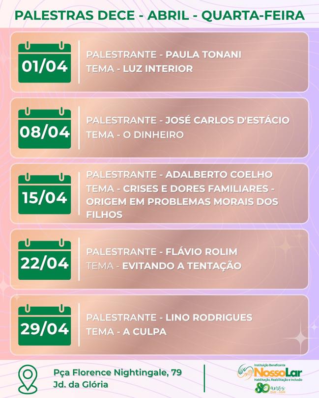 Divulgação palestras Instituição Beneficente Nosso Lar abril 2026 |