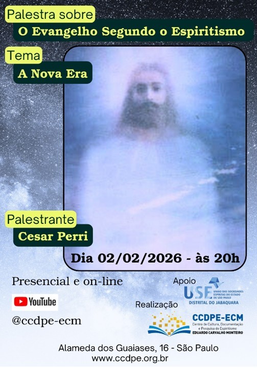 No dia 02 de fevereiro, às 20 horas, Cesar Perri fará palestra presencial no Centro de Cultura, Documentação e Pesquisa do Espiritismo de São Paulo, com transmissão pela internet, sobre o tema “A nova era”, dando continuidade ao Capítulo I – Não vim destruir a Lei, de “O Evangelho segundo o Espiritismo”. Trata-se de série de palestras sobre essa obra de Allan Kardec. Em seguida há passes. O Centro de Cultura, Documentação e Pesquisa do Espiritismo Eduardo Carvalho Monteiro, de São Paulo localiza-se na Alameda dos Guaiases, 16 – Indianópolis/Planalto Paulista, São Paulo. Para acompanhar on line no dia 02/02: https://www.youtube.com/watch?v=p1ObIrWMbjM