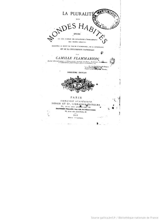 Pluralidade dos mundos habitados.Camille Flammarion Acesse a edição em francês aqui: https://gallica.bnf.fr/ark:/12148/bpt6k246240/f5.image.texteImage |