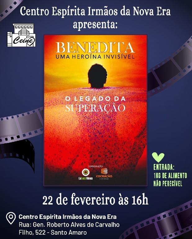 O Centro Espírita Irmãos da Nova Era, localizado no bairro Santo Amaro, em São Paulo exibirá o filme “Benedita. Uma heroína invisível. O legado da superação”, produzido por Lalucci Filmes e dirigido por Sirlei Nogueira. Trata-se da primeira exibição após a desencarnação do diretor Sirlei. Dia 22/02/2026 – 16 horas; Endereço: Rua Gen. Roberto Alves de Carvalho Filho, 522 - Santo Amaro – São Paulo. (Informações para exibições do filme: [email protected])