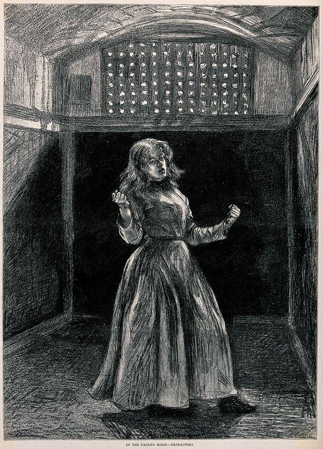 Uma mulher em uma cela acolchoada. 1889. Imagem/fonte: https://en.wikipedia.org/wiki/Padded_cell