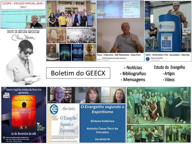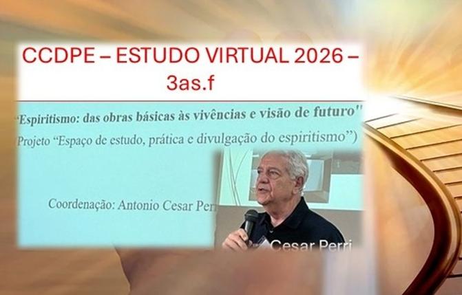 Nota: “ESPIRITISMO: DAS OBRAS BÁSICAS ÀS VIVÊNCIAS E VISÃO DE FUTURO" Comunicado do CCDPE - Diretoria de Cultura e Estudos Espíritas Estudo das 3ªs.fs para 2026 com Cesar Perri: Informamos sobre o estudo para 2026: “ESPIRITISMO: DAS OBRAS BÁSICAS ÀS VIVÊNCIAS E VISÃO DE FUTURO" (PROJETO “ESPAÇO DE ESTUDO, PRÁTICA E DIVULGAÇÃO DO ESPIRITISMO”) Coordenação: Antonio Cesar Perri de Carvalho. Suporte Técnico: Kátia Golinelli. 1) Tópicos da programação: - Anotações históricas e doutrinárias; - Centro Espírita; - Estudo; - Mediunidade; - Movimento e união. Temas fundamentados nas Obras básicas e clássicas, psicográficas de Chico Xavier, e, obras atuais específicas sobre os temas. 2) O estudo virtual será iniciado no dia 24 de fevereiro de 2026 3ªf às 20h. 3) Inicialmente todos os participantes do grupo de estudo “A Caminho da Luz” (de 2025) terão acesso ao estudo com acesso pelo link a ser fornecido até dia 13 de fevereiro; 4) Após essa fase inicial os participantes do grupo de 2025 e os novos, farão inscrição específica e completa em link que será fornecido pelo CCDPE; 5) Os novos interessados deverão fazer contato com o coordenador do estudo Cesar Perri ([email protected]) ou com a Kátia Golinelli ([email protected]); 6) Independente do estudo virtual tradicional das 3ªs.fs, para esse programa de 2026 serão realizadas reuniões presenciais mensais na sede da CCDPE. Serão reuniões teórico/práticas, de troca de ideias sobre o conteúdo do estudo em andamento e sobre sua aplicabilidade. Essas reuniões extras será uma opção para os que residam na cidade de São Paulo ou em outras cidades e que queiram participar. Não há exigência para que os integrantes do estudo virtual das 3ªs.fs. participem das reuniões presenciais. 7) Assim, convidamos a todos para frequentarem o estudo virtual a ser iniciado no dia 24/02/2026, 3ªf. 8) Aos frequentadores do estudo interessados e que tiverem disponibilidade, convidamos para comparecerem na sede do CCDPE (Alameda dos Guaiases, 16 – Indianópolis/Planalto Paulista -São Paulo), no dia 11 de abril – sábado – às 15h. Maiores esclarecimentos sobre estas reuniões serão fornecidas na abertura do estudo virtual e presencialmente no dia 11/04/2026. Abraços, Cesar Perri e Pedro Nakano