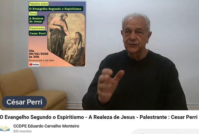 Em palestra presencial e transmitida pela internet no dia 09 de fevereiro, Cesar Perri desenvolveu o tema “A realeza de Jesus”, comentando a frase do Mestre: “Sou rei, mas o meu reino não é deste mundo”, com base no Capítulo II de “O Evangelho segundo o Espiritismo”. Na sede do Centro de Cultura, Documentação e Pesquisa do Espiritismo de São Paulo, às 2as feiras, 20 horas, desenvolve-se uma série de palestras sobre essa obra de Allan Kardec. Em seguida há passes. O Centro de Cultura, Documentação e Pesquisa do Espiritismo Eduardo Carvalho Monteiro, de São Paulo localiza-se na Alameda dos Guaiases, 16 – Indianópolis/Planalto Paulista, São Paulo. A reunião do dia 16 – entre feriados – está suspensa. Retorna no dia 23/02. Acesse pelo link: https://www.youtube.com/watch?v=IQwOye7BlG8
