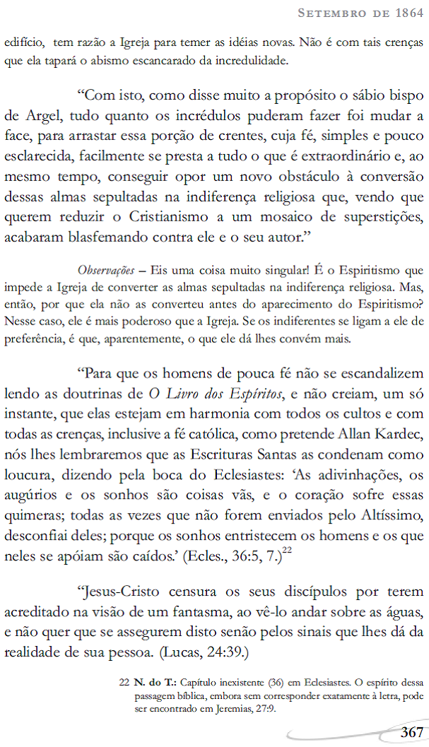 Esses estudos e aprofundamentos em todos os Livros da Doutrina são plasmados, como já dissemos, nas centenas de Notas do Tradutor (N. do T.), colocadas no final das nossas traduções, que constituem pesquisas nas próprias Obras de Kardec, as quais têm todas elas relação direta com a Revista Espírita, o que nos obriga, como espíritas, o dever de conhecer e estudar seriamente os 12 volumes da Revue Spirite – Journal d’Études Psychologiques, que possui no seu original francês, nada menos que 4409 páginas. Isto sem contar as monumentais 5 Obras Básicas, chamadas O Pentateuco Kardequiano (com 2413 pp.), e os 13 Livros Complementários, que também são de um sabor extraordinário (com 958 páginas originais).