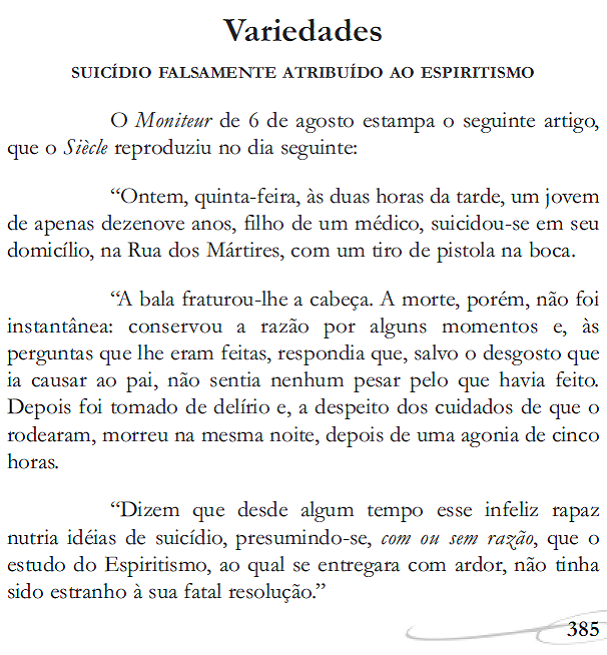 Página do jornal Le Siècle da 7 de agosto de 1864 e recorte noticiando o suicídio de um jovem de 19 anos com um tiro na boca. Alguns detratores atribuiram o fato por ele ter estudo o Espiritismo outros que o conheciam atestaram que a motivação era bem outra, ou seja, por motivos pessoais. Na Revista Espírita de setembro de 1864, acima repassada, Allan Kardec comenta o fato e a real motivação do ato praticado pelo jovem com base em depoimento daqueles que o conheciam. Jornal Le Siècle. Fonte: https://gallica.bnf.fr/ark:/12148/bpt6k729904p/f2.item.zoom |