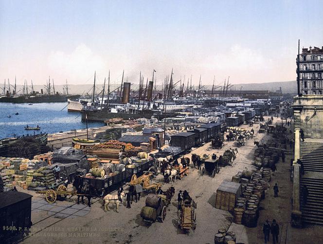 O Cais de Joliette e os mensageiros maritimos. Marseille. França. Imagem/fonte: https://fr.wikipedia.org/wiki/Histoire_de_Marseille#/media/Fichier:Marseille_-_Quai_de_la_Joliette.jpg |
