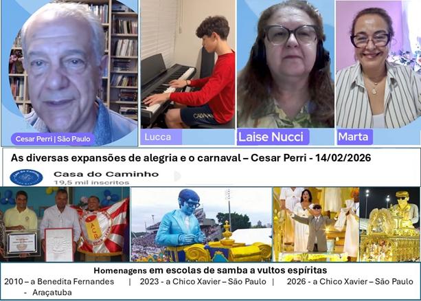 Em exposição virtual na noite do dia 14 de fevereiro, Cesar Perri (São Paulo) conduziu uma reflexão sobre as diversas expansões da alegria. À luz do livre-arbítrio, refletiu sobre responsabilidade e consequências, lembrando André Luiz: “A verdadeira alegria não foge da temperança”. Citou livros psicográficos de Chico Xavier e Divaldo Pereira Franco relacionados com temas de “casa mental” e carnaval. Comentou homenagens populares de escolas de sambas, espontâneas e desinteressadas a vultos espíritas desencarnados como Benedita Fernandes (enredo da Escola de Samba Unidos da Zona Leste, premiada, em Araçatuba - 2010); Chico Xavier, em São Paulo: no desfile de 2023 com carro alegórico da Escola de Samba Gaviões da Fiel; em 2026 a Escola de Samba Tom Maior focalizou Chico no enredo, carro alegórico e caracterizado pelo ator Renato Prieto. Trata-se do programa “Evangelho do trabalhador” transmitido pelo Grupo Espírita Casa do Caminho. A reunião virtual foi coordenada por Laise Nucci e Maria Marta da Silva, e, previamente houve apresentação ao piano pelo jovem Lucca Casagrande. Acesse pelo link: https://www.youtube.com/live/-YwNvd4IYdY?si=0tKQ2EkBxJOBLp13