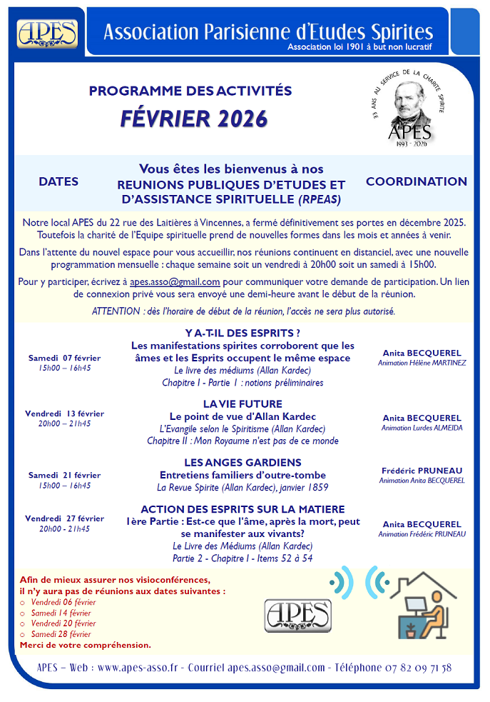 Suite à la fermeture de nos locaux à Vincennes et dans l’attente de trouver un nouveau lieu pour poursuivre, en présentiel, nos Réunions Publiques d'Etudes et d'Assistance Spirituelle (RPEAS) et les Réunions d'Etude de l'Évangile avec les demandeurs d'Assistance Spirituelle (AS), notre centre spirite APES maintient ses réunions, ainsi que d'autres activités, et des travaux d’étude spirite en distanciel via plateforme ZOOM. Fidèles à notre engagement d’approfondir ensemble les enseignements du Spiritisme dans un esprit de sérieux, de réflexion et de fraternité, nous reprenons l’envoi de notre programme mensuel. Vous y trouverez les titres des exposés hebdomadaires ainsi que les informations nécessaires pour participer à nos réunions en ligne. Veuillez trouver en pièce jointe le programme d'activités spirites du mois de FÉVRIER 2026 ; Pour assister les Réunions Publiques d'Etudes et d'Assistance Spirituelle (RPEAS) veuillez accéder les modalités de participation sur la page WEB de notre centre spirite APES : http://www.apes-asso.fr Nous espérons que cette organisation provisoire permettra à chacun de continuer à s’instruire, à échanger et à progresser dans la compréhension les principes, les concepts et l'éthique spirite, dans un climat de respect et d’élévation morale. Pour plus d'information, contactez nous par téléphone 07 8209 7158 ou par mail : [email protected] Nous vous remercions pour votre fidélité et votre soutien, et nous nous réjouissons de vous retrouver prochainement lors de nos prochaines réunions hebdomadaires d’étude spirite. Fraternellement, Anita Becquerel Présidente de l'APES A.P.E.S. - Association