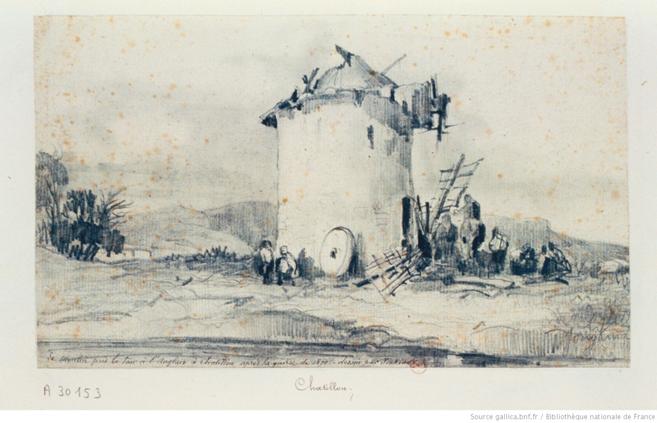 O moinho perto da torre inglesa em Châtillon após a guerra de 1870 / desenho de Jongkind Imagem/fonte: https://gallica.bnf.fr/ark:/12148/btv1b7740116w.item
