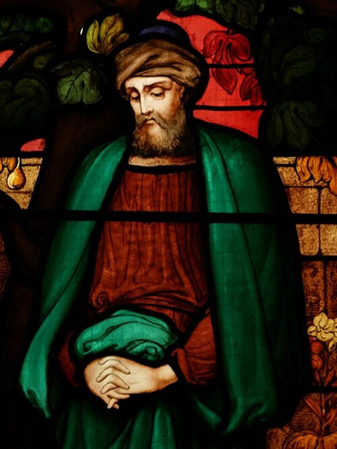Painel de vitral no transepto da Igreja Anglicana de São João, Ashfield, Nova Gales do Sul (NSW). Esta cena retrata Natanael sob uma figueira, com as palavras ditas a ele por Jesus: "Eis um verdadeiro israelita, em quem não há dolo" (João 1:47). A inscrição nesta janela memorial diz: "Em memória de [George Mackenzie Holden]. Nascido em 25 de abril de 1841. [Falecido em 25 de maio de 1881.]" (Metade das palavras está em um painel duplo.) Data: 12 de novembro de 2009 Fonte: Trabalho próprio Autor: Vitral: Lyon and Cottier, foto: Toby Hudson. Imagem/fonte: https://commons.wikimedia.org/wiki/File:StJohnsAshfield_StainedGlass_Nathanael_(cropped).jpg |